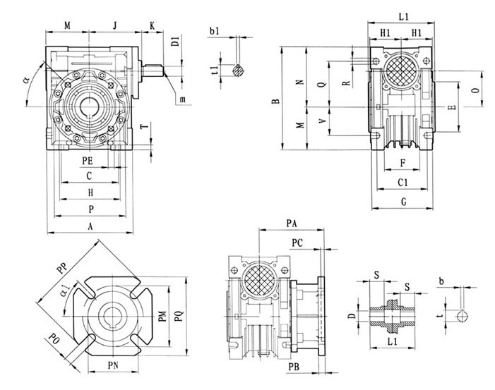 型號 | Q | R | S | T | V | PE | b | b1 | t | t1 | m | α | Kg. |